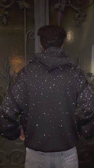 Our signature black hoodie reimagined as pure luxury. Cut in the same relaxed, oversized fit you love, this statement piece is completely hand-embellished with hundreds of sparkling rhinestones that cascade from the shoulders and sleeves like a glittering night sky.